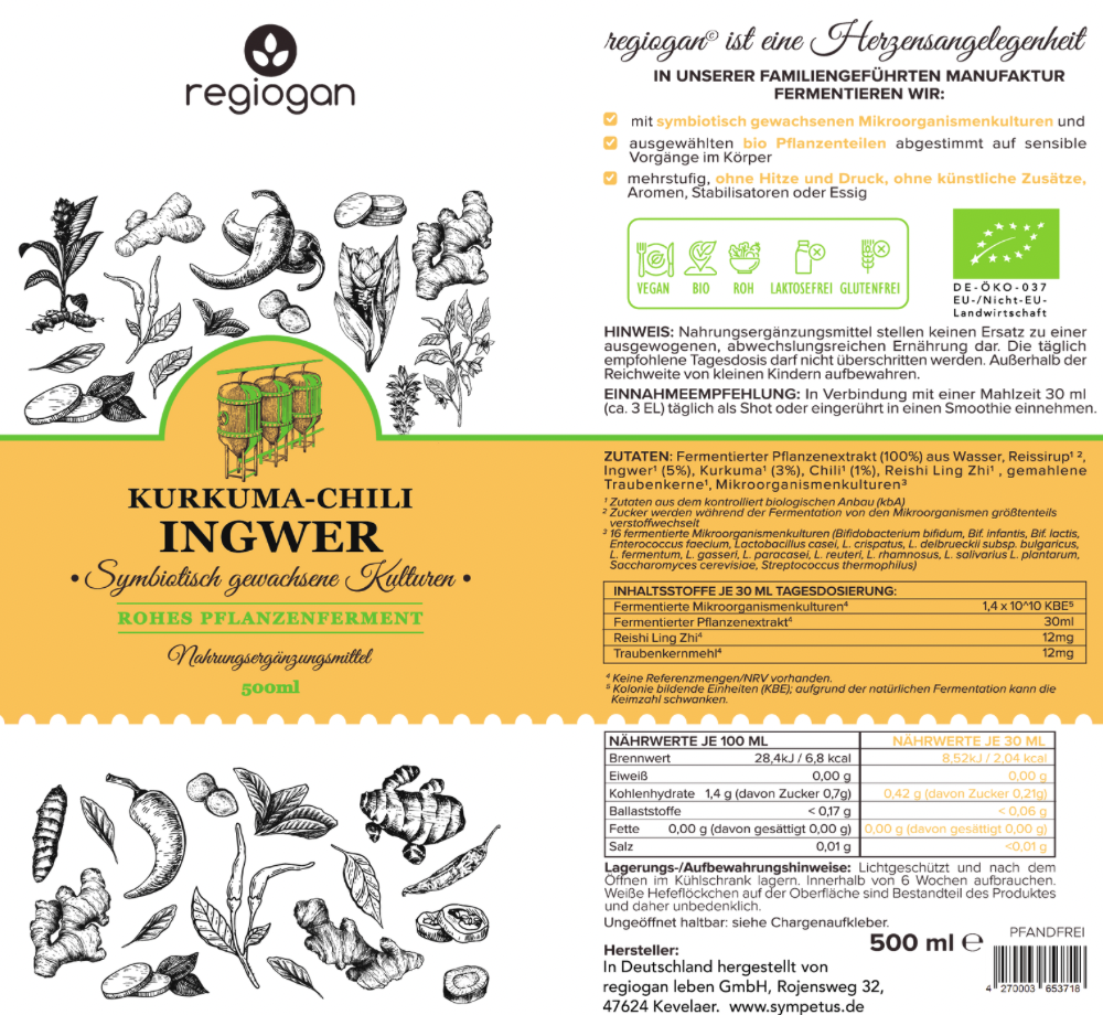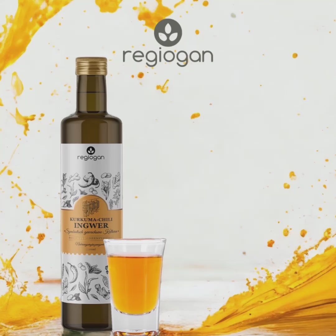 Regiogan Turmeric-Chili-Ginger is produced without added alcohol. Because it matures through fermentation, however, it contains a negligibly low and fluctuating alcohol content. The total alcohol content in the bottle is less than that of a ripe banana, and therefore, especially at the 30 ml dose, is not considered problematic. It is therefore also safe for children to consume.
