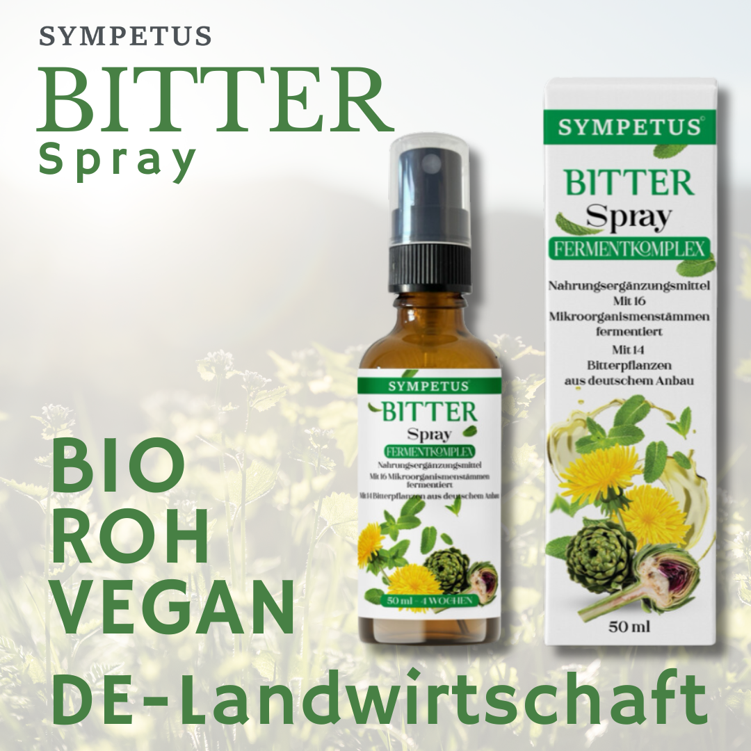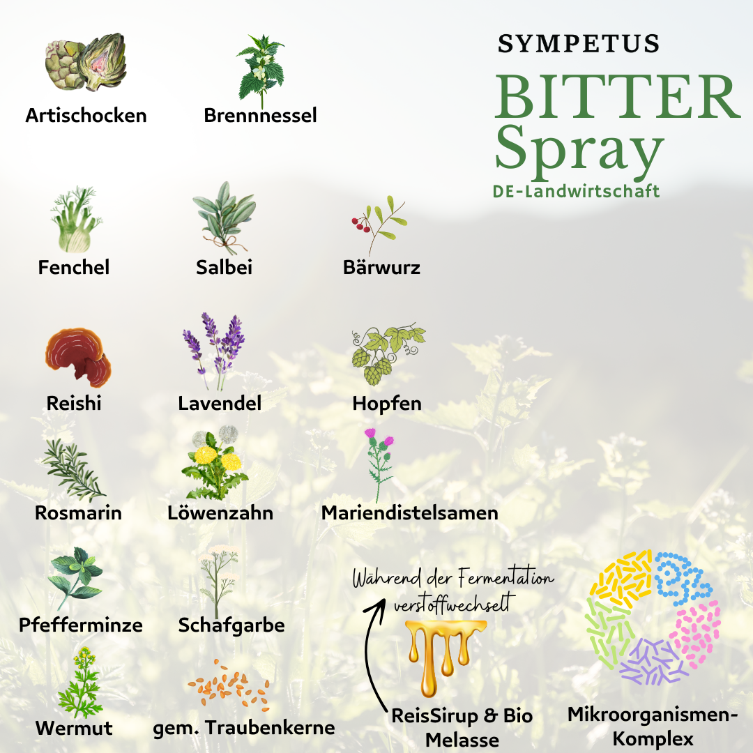 Das BITTER Spray ohne Zusatz von Alkohol. Da es durch Fermentation gereift ist, enthält es jedoch einen verschwindend geringeren und schwankenden Gehalt an Alkohol, der in der Gesamtmenge der Flasche noch unterhalb einer reifen Banane liegt und daher gerade bei der Dosis von 1,75 ml nicht als problematisch einzuschätzen ist. Für Kinder also ebenso ohne Bedenken einzunehmen.